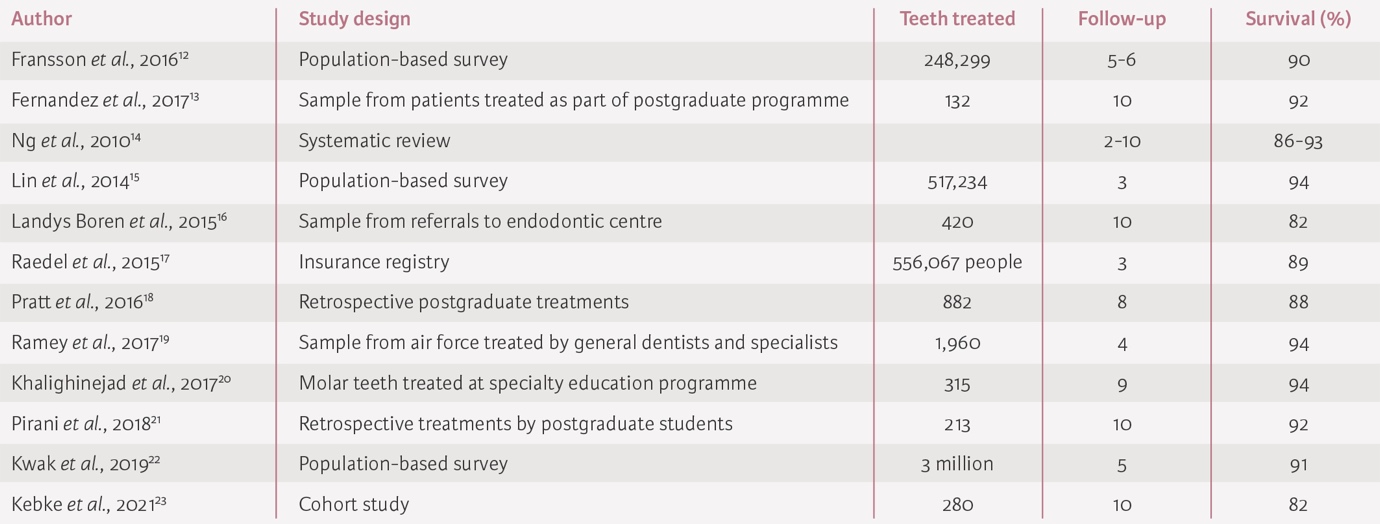 Tooth survival has been reported as the most critical outcome in endodontics. A tooth is said to have survived if it remains as part of the dentition while maintaining functionality.11 Survival rates for endodontics are uniformly high in the literature (Table 2). Even with some persistent disease, if a tooth is asymptomatic and functional, the patient may deem this a success, and may opt not to have further treatment completed, highlighting patient autonomy in setting less demanding goals for treatment. The impact of accepting a tooth with periapical disease is unknown, and more research is needed concerning the risks associated with retaining such a tooth. Despite its importance, the representation of this outcome in the literature is low.5