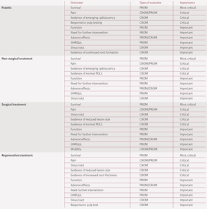 The implementation of evidence-based practice into the clinical setting requires integrating results from high-quality primary research. To overcome the emphasis on technical, clinician-focused outcomes, there has been interest in the formulation of an agreed set of standardised outcomes in endodontic trials, as seen in other areas of dentistry.38 The importance of a COS has been highlighted by the Grading and Recommendations, Assessment, Development and Evaluation (GRADE) group, an international system that assesses the evidence and quality of healthcare research, to form the basis for recommendations in endodontics.