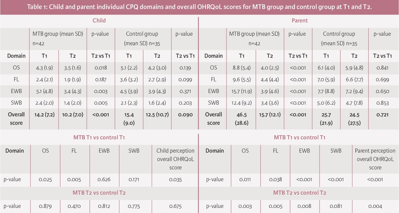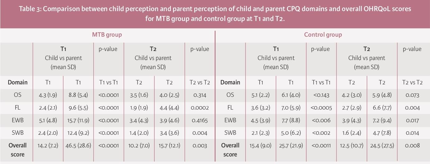 At T1, parents of children in both groups perceived their child to have a poor overall OHRQoL score; for the MTB group, this was rated almost twice that reported for the control group (46.5 vs 25.7; p<0.001). Parents perceived a significant difference in all four domains (OS, FL, EWB, and SWB). At T2, in the MTB group, there was a significant improvement in the parent’s perception of their child’s overall OHRQoL (p<0.001). There was no significant change in the control group (25.7 vs 24.5; p=0.721). When comparing both parental groups at T2, the parents of the control group had a significantly poorer rating of their child’s overall OHRQoL score across all domains (p<0.004) (Table 1).