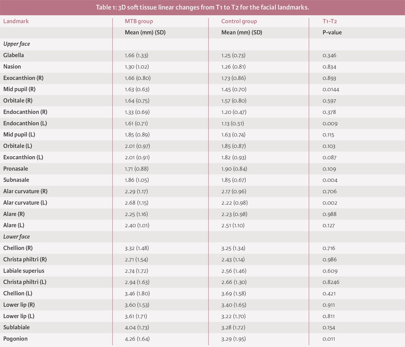 3D soft tissue linear changes in MTB and control groups from T1 to T2