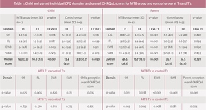 At T1, the mean family QoL score in the MTB group was significantly poorer (13.6; SD 9.9) than the mean family QoL score in the control group (6.9; SD 7.5, p=0.0008). Following Phase 1 treatment with an MTB, the family QoL improved substantially (13.6 (SD 9.9) to 2.4 (SD 2.3); p<0.0001), but was no different in the control group (6.9 (SD 7.5) to 5.2 (SD 8.3); p=0.221). The mean scores at T2 were significantly different between groups (p=0.0024).