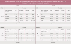 At T1, 62% of parents of the MTB group perceived a moderate or definite AC-IOTN, and at T2 this had reduced to 12% (p<0.001). At T1, 57% of parents of the control group perceived a moderate or definite AC-IOTN, and at T2 this reduced to 40% but was not significantly different (p=0.202) (Table 2).