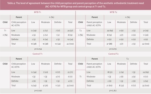 At T1, in the MTB group, 46% of children and parents perceived a similar aesthetic orthodontic treatment need (p=0.054). At T2, following MTB treatment, 69% of children and parents perceived a low treatment need, and although 19% of children perceived a moderate need, their parents perceived a low need (p=0.019) (Table 4).